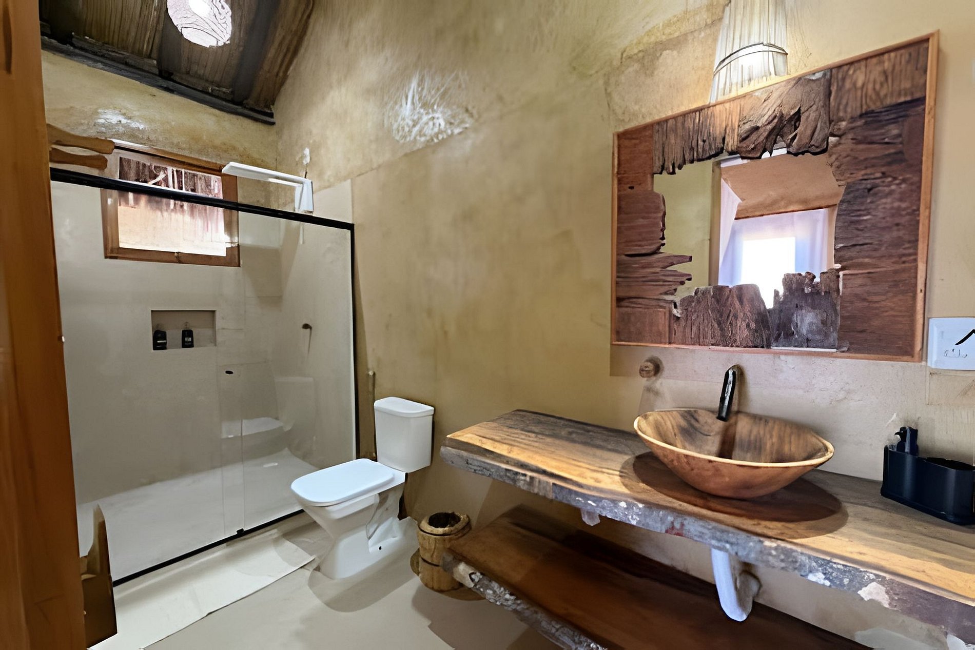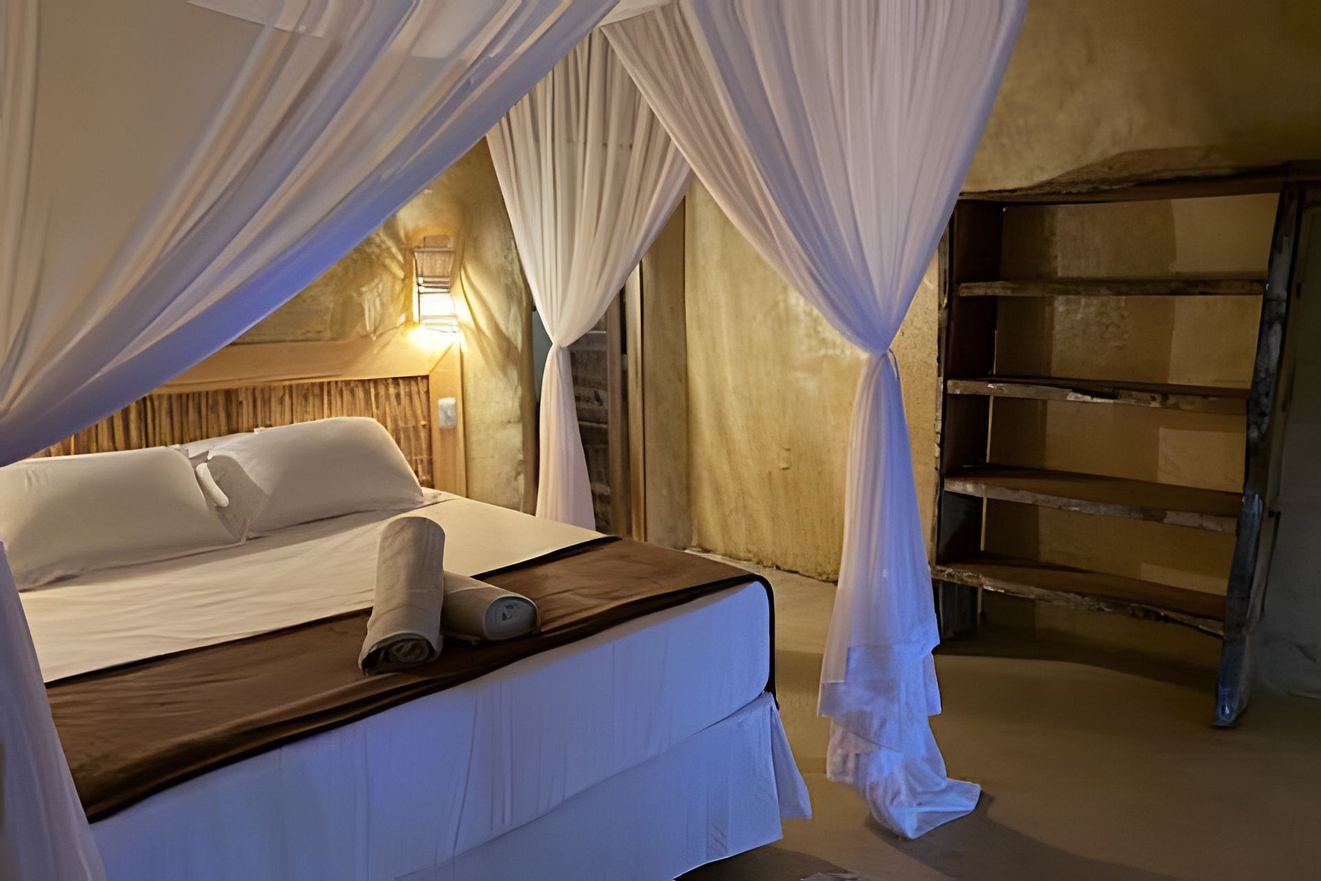 Os bangalôs artesanais, feitos com materiais naturais, contam com ar-condicionado, TV e iluminação suave, pensados para o descanso. Aqui, o tempo desacelera e o luxo está no essencial.