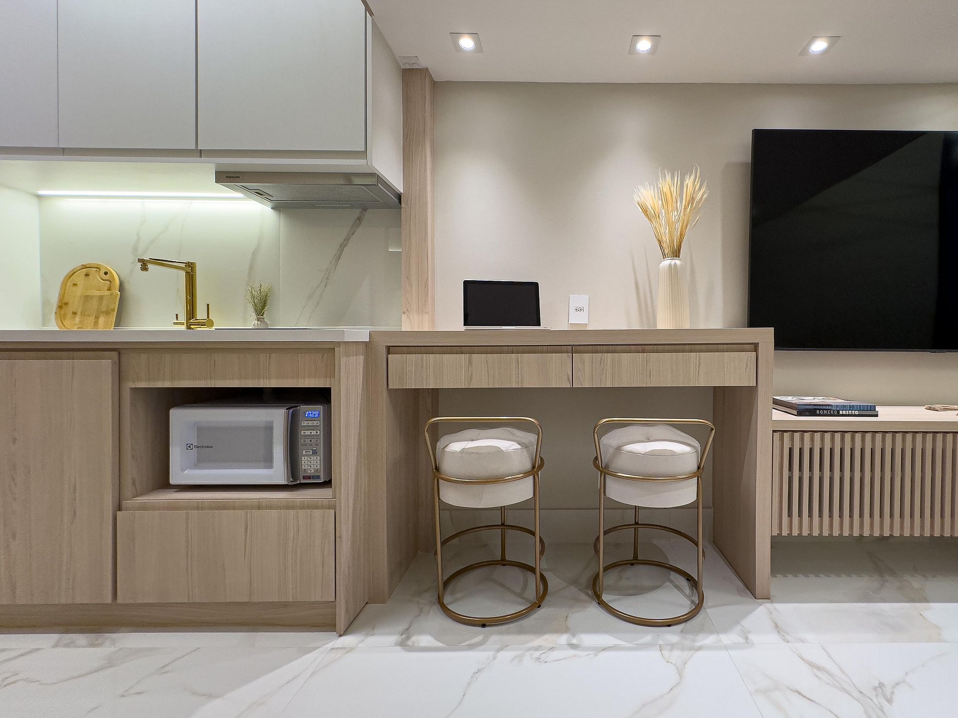 - Cozinha americana equipada com: geladeira, micro-ondas, cooktop, liquidificador, talheres, copos, panelas e utensílios diversos